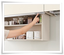 - 吊戸棚を「オートムーブ型」に: 背の低い方で手が届かない吊戸棚が、ボタン一つで棚が降りてくるオートムーブ機能付きのものも選択できます。これなら、デッドスペースだった上段も有効活用できますね!