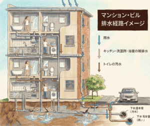 ですが実際には、各住戸から出た排水は建物の外にある“共用部の地中配管”を通って流れています。