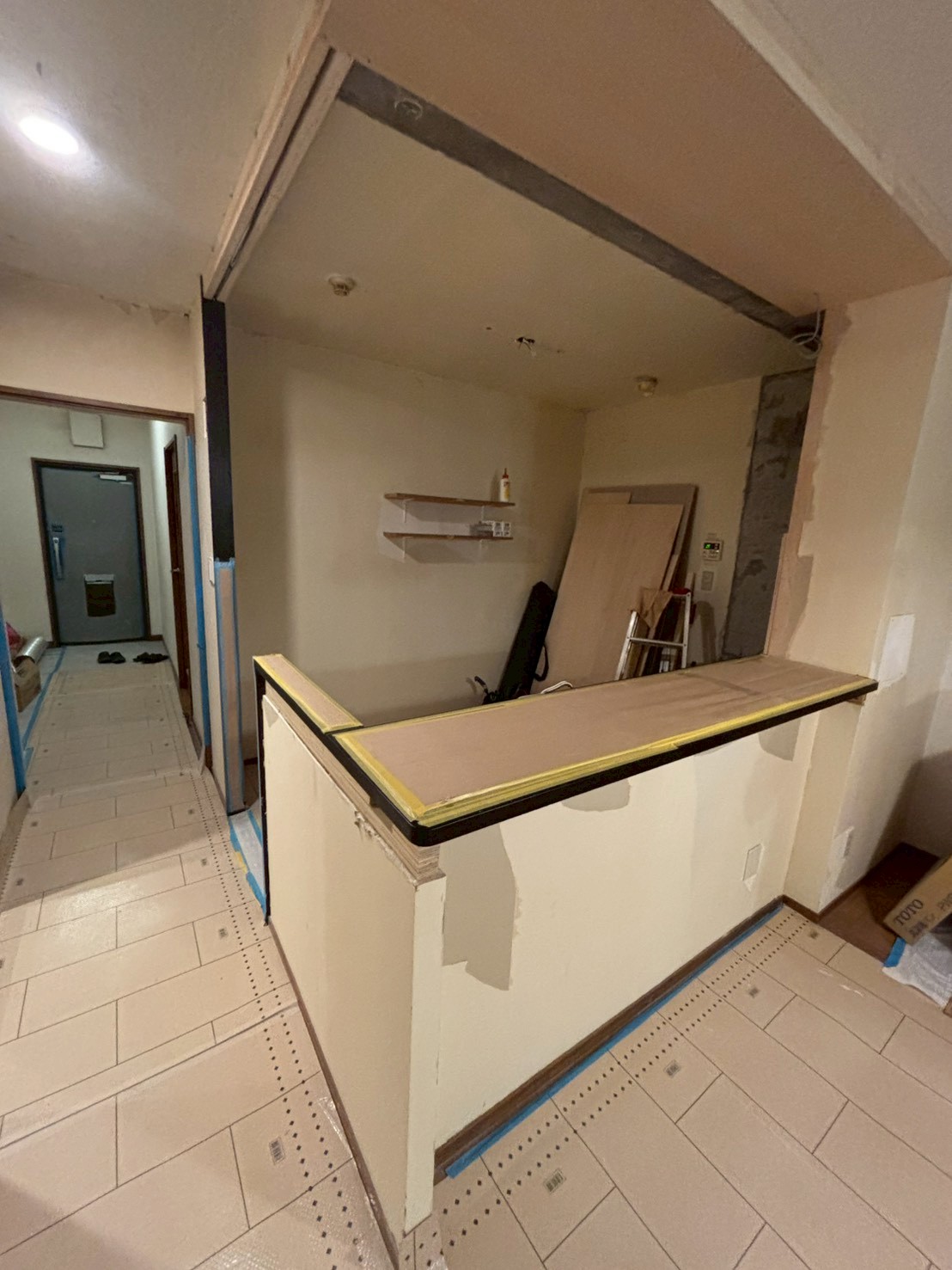 今回のマンションリフォームでは、袖壁と垂れ壁を撤去し、新しいカウンターとシステムキッチンを設置しました。