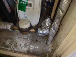 「メーターボックス内が濡れている」とのご連絡を受け、現地を確認すると、床面に明らかな水濡れが見られました。