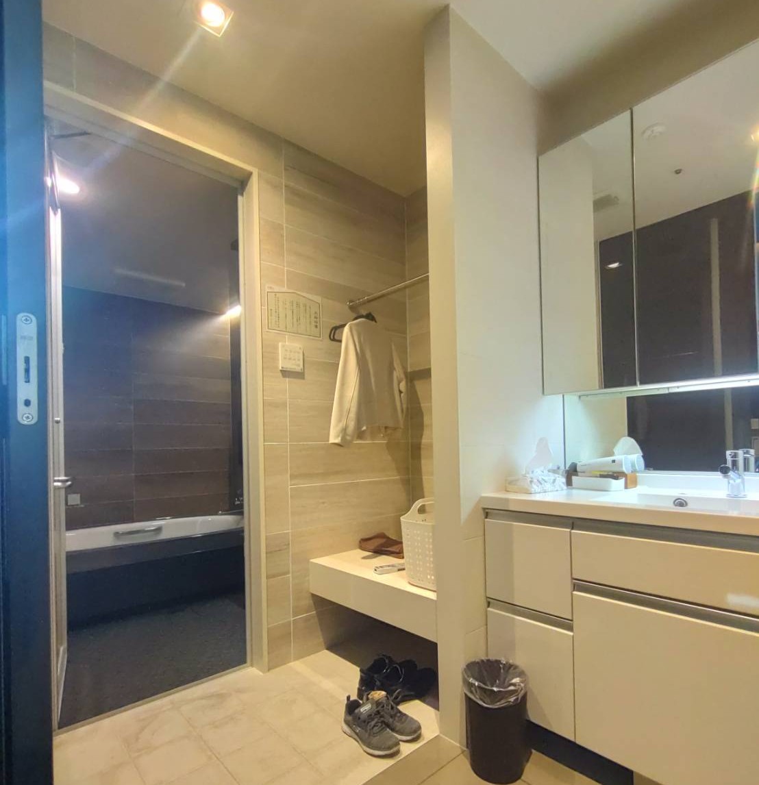 体験入浴室の横には、広々としたパウダールームも完備されています。 清潔感あふれるモダンなデザインで、鏡裏やカウンター下の収納も充実しており、実際に使う場面を想定しながら確認していただけます。