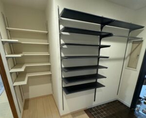 また樹脂製の棚板を使うことで靴を置いても汚れたら棚板を洗うことができる玄関収納にもアームハングは大活躍!!