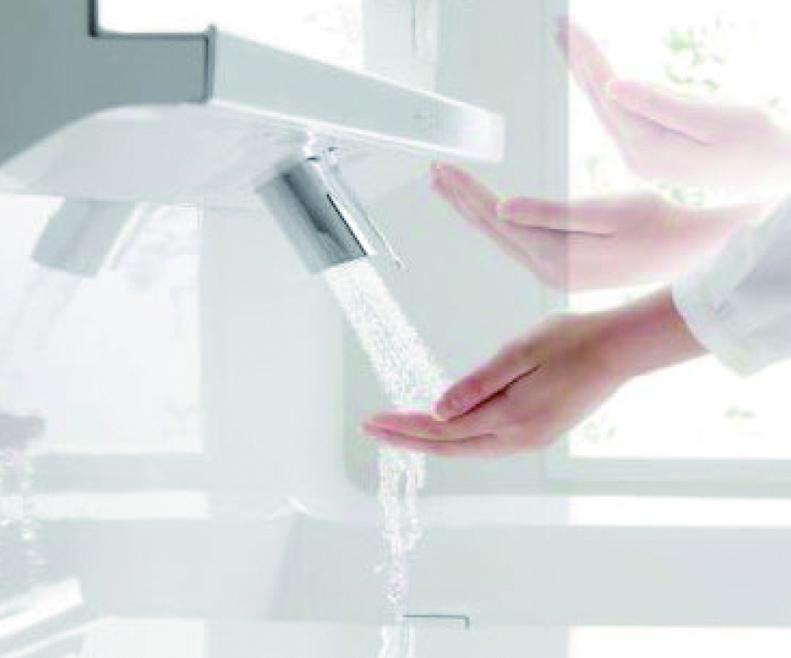 センサーが手を感知して自動で吐水。レバーに直接触れる必要がないため、花粉やウイルスを付着させることなく、清潔に手を洗えます。