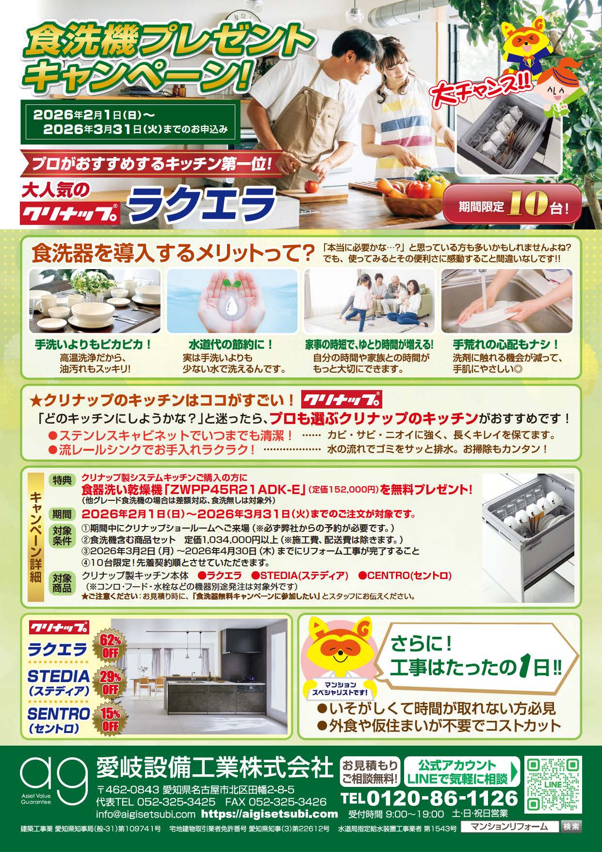アイギ設備では今だけ、対象期間中にキッチンをご成約いただいたお客様に、ビルトイン食洗機を【無料】プレゼント!