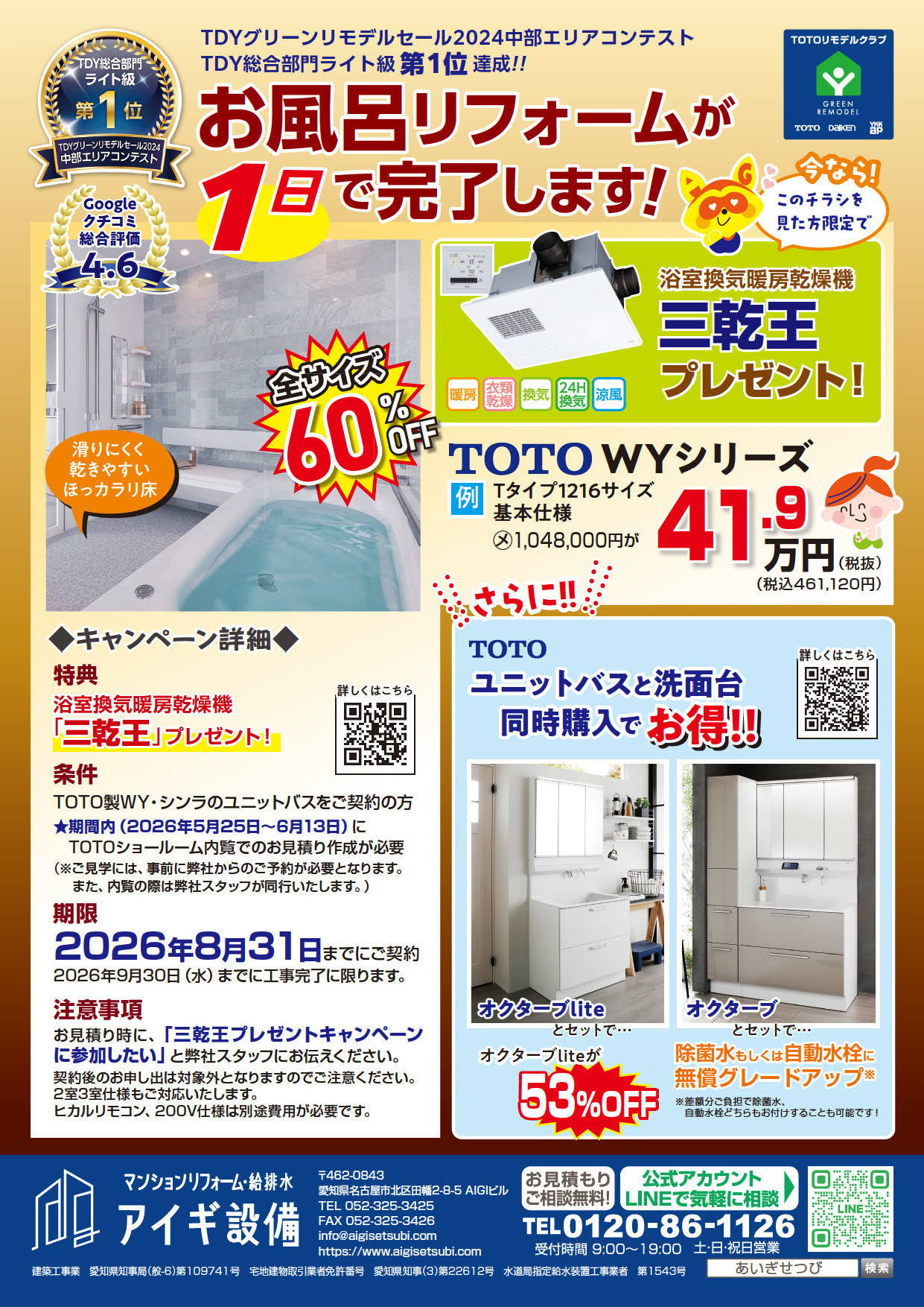 アイギ設備では、対象期間中にユニットバスをご成約いただいたお客様へ、